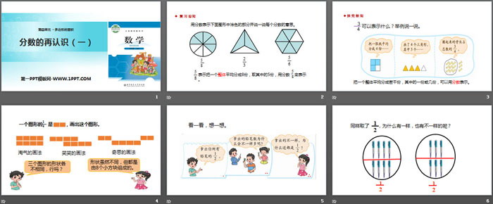 关键词:北师大版五年级上册数学PPT课件免费下载,分数的再认识PPT下载,分数的意义PPT下载,.PPT格式;