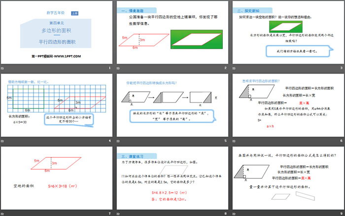 关键词:北师大版五年级上册数学PPT课件免费下载,平行四边形的面积PPT下载,多边形的面积PPT下载,.PPT格式;