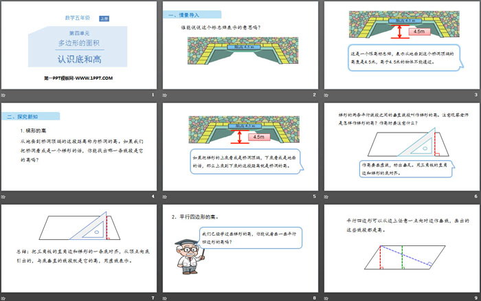 关键词:北师大版五年级上册数学PPT课件免费下载,认识底和高PPT下载,多边形的面积PPT下载,.PPT格式;