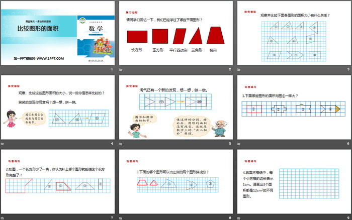 关键词:北师大版五年级上册数学PPT课件免费下载,比较图形的面积PPT下载,多边形的面积PPT下载,.PPT格式;