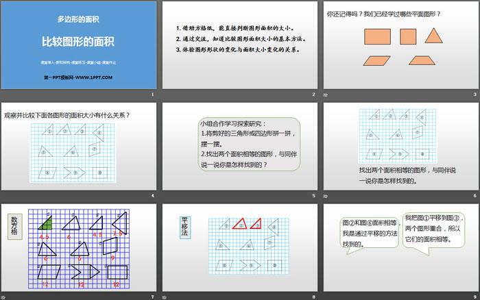关键词:北师大版五年级上册数学PPT课件免费下载,比较图形的面积PPT下载,多边形的面积PPT下载,.PPT格式;