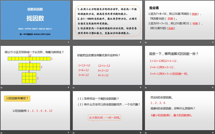关键词:北师大版五年级上册数学PPT课件免费下载,找因数PPT下载,倍数与因数PPT下载,.PPT格式;