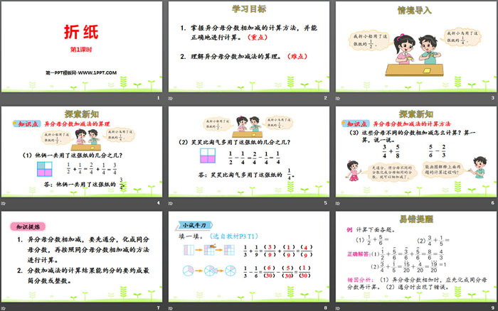 关键词:北师大版五年级下册数学PPT课件免费下载,折纸PPT下载,分数加减法PPT下载,.PPT格式;