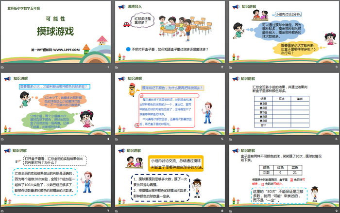 关键词:北师大版五年级上册数学PPT课件免费下载,摸球游戏PPT下载,可能性PPT下载,.PPT格式;
