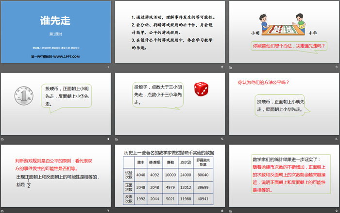 关键词:北师大版五年级上册数学PPT课件免费下载,谁先走PPT下载,可能性PPT下载,.PPT格式;