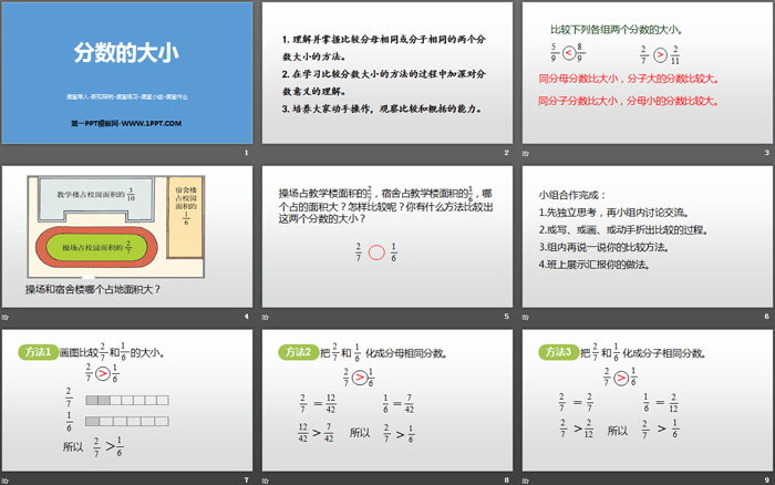 1.理解并掌握比较分母相同或分子相同的两个分数大小的方法。