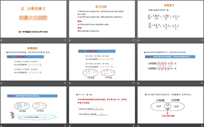 关键词:北师大版五年级上册数学PPT课件免费下载,找最大公因数PPT下载,分数的意义PPT下载,.PPT格式;