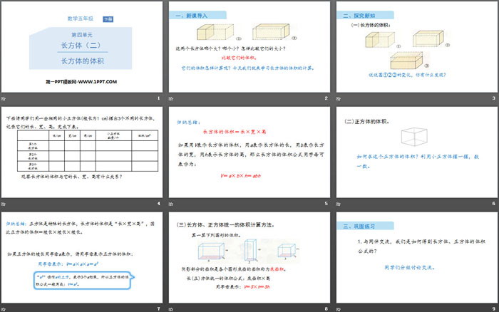 关键词:北师大版五年级下册数学PPT课件免费下载,长方体的体积PPT下载,长方体PPT下载,.PPT格式;