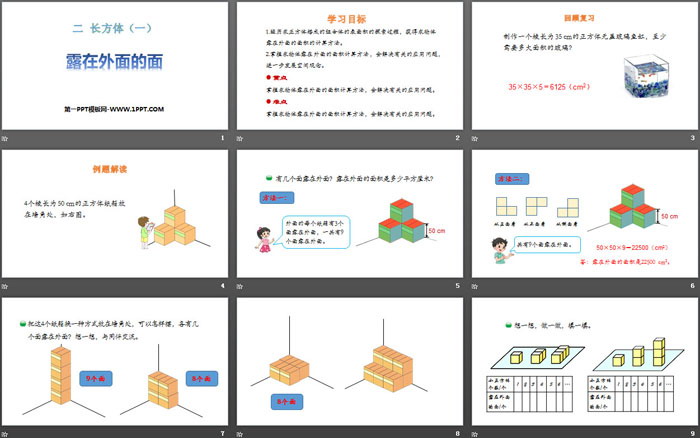 关键词:北师大版五年级下册数学PPT课件免费下载,露在外面的面PPT下载,长方体PPT下载,.PPT格式;