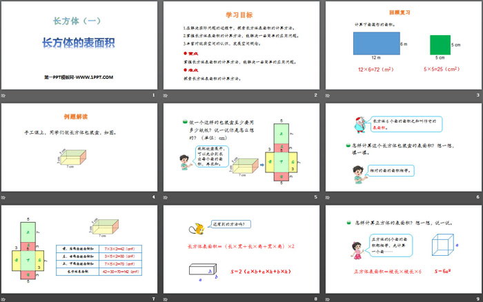 关键词:北师大版五年级下册数学PPT课件免费下载,长方体的表面积PPT下载,长方体PPT下载,.PPT格式;
