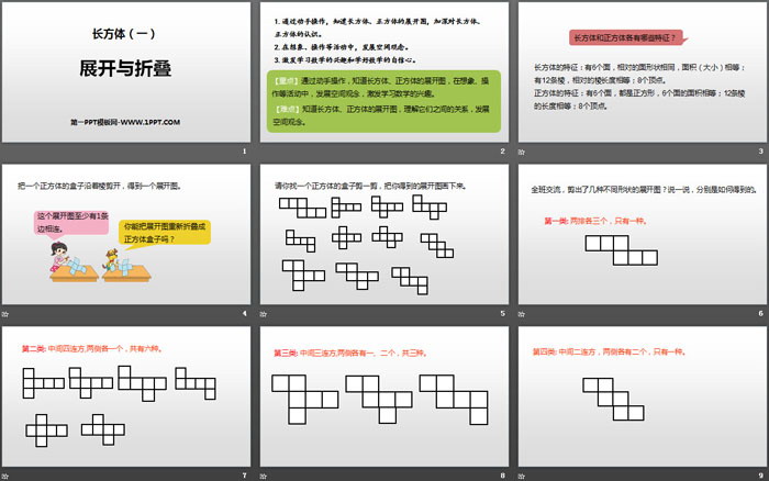 关键词:北师大版五年级下册数学PPT课件免费下载,展开与折叠PPT下载,长方体PPT下载,.PPT格式;