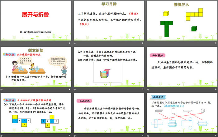 关键词:北师大版五年级下册数学PPT课件免费下载,展开与折叠PPT下载,长方体PPT下载,.PPT格式;