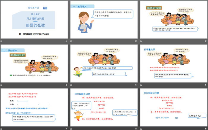 关键词:北师大版五年级下册数学PPT课件免费下载,邮票的张数PPT下载,用方程解决问题PPT下载,.PPT格式;