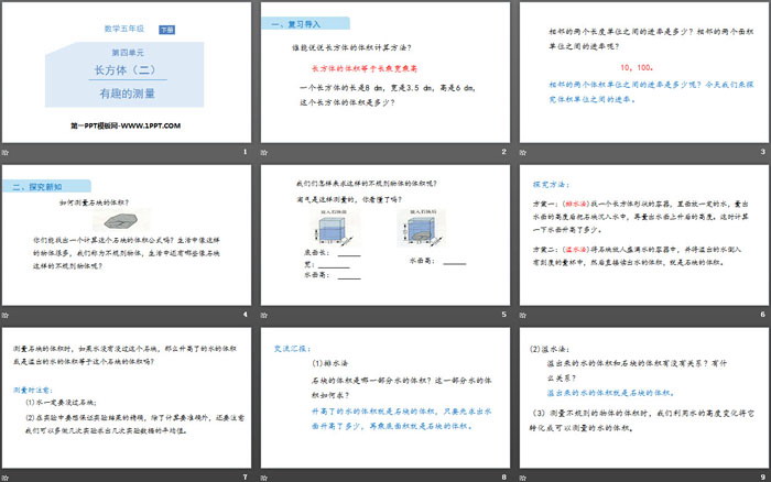 关键词:北师大版五年级下册数学PPT课件免费下载,有趣的测量PPT下载,长方体PPT下载,.PPT格式;