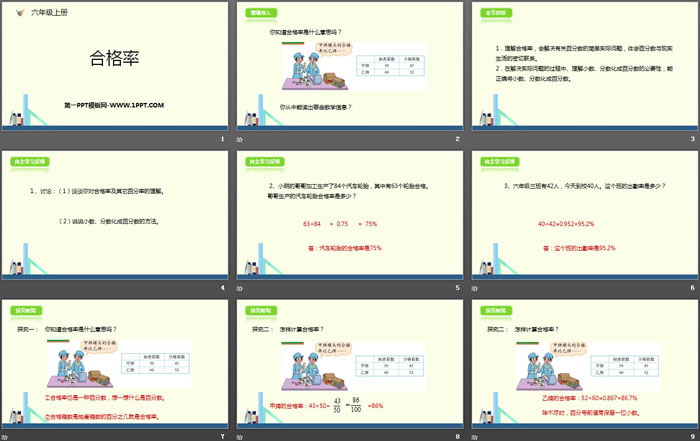 关键词:北师大版六年级上册数学PPT课件免费下载,合格率PPT下载,百分数PPT下载,.PPT格式;