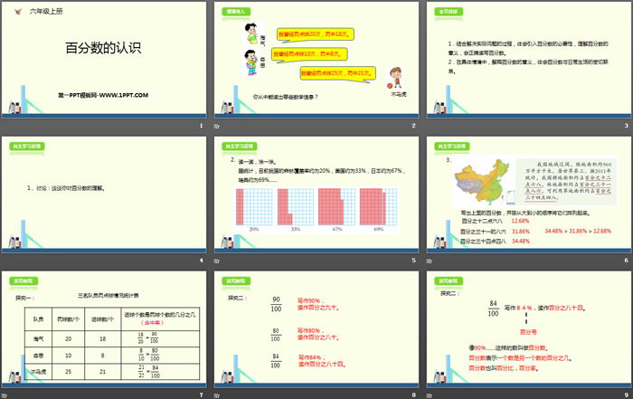 1.结合解决实际问题的过程,体会引入百分数的必要性,理解百分数的意义,会正确读写百分数。