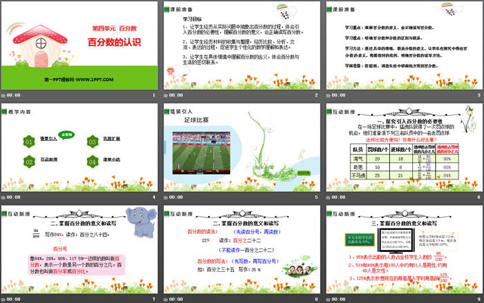 1.让学生经历从实际问题中抽象出百分数的过程,体会引入百分数的必要性,理解百分数的意义,会正确读写百分数。