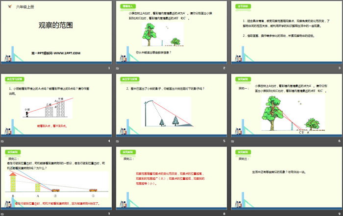 关键词:北师大版六年级上册数学PPT课件免费下载,观察的范围PPT下载,观察物体PPT下载,.PPT格式;