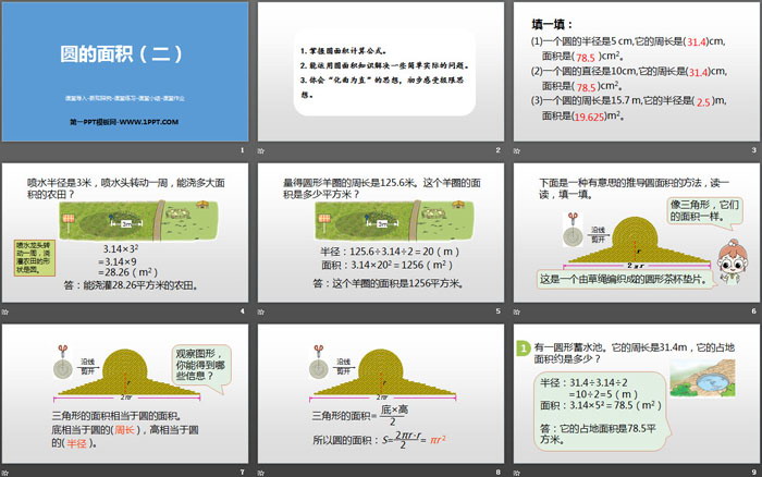 1.在计算有关面积的实际问题时要把问题转化成圆,找到圆的半径,就能计算出面积了。