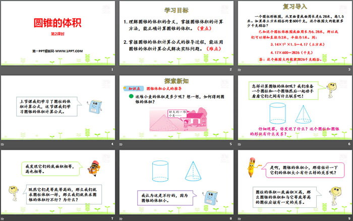1.理解圆锥的体积的含义,掌握圆锥体积的计算方法,能正确计算圆锥的体积。(重点)