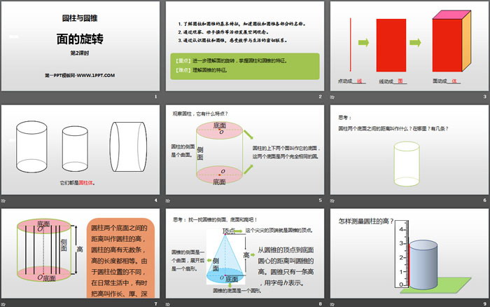 关键词:北师大版六年级下册数学PPT课件免费下载,面的旋转PPT下载,圆柱与圆锥PPT下载,.PPT格式;