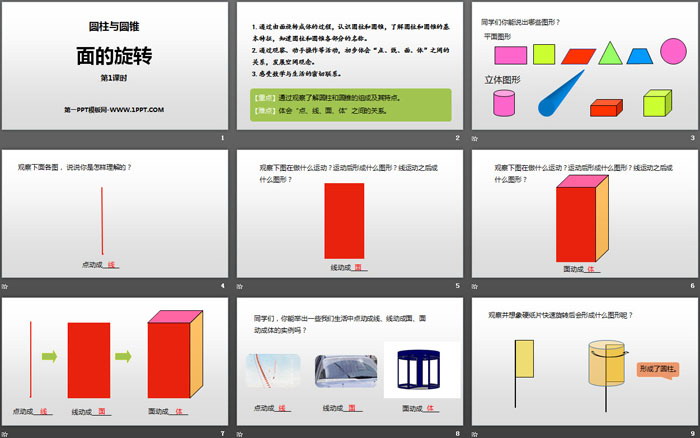 关键词:北师大版六年级下册数学PPT课件免费下载,面的旋转PPT下载,圆柱与圆锥PPT下载,.PPT格式;