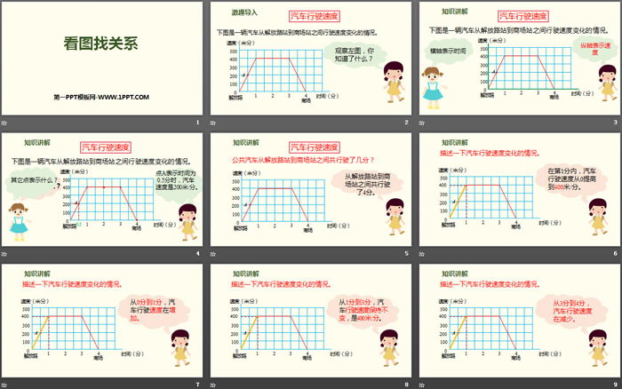 在第1分内,汽车行驶速度从0提高到400米/分。