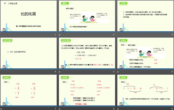 关键词:北师大版六年级上册数学PPT课件免费下载,比的化简PPT下载,比的认识PPT下载,.PPT格式;
