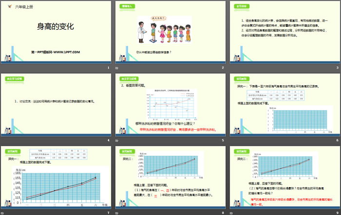 关键词:北师大版六年级上册数学PPT课件免费下载,身高的变化PPT下载,数据处理PPT下载,.PPT格式;