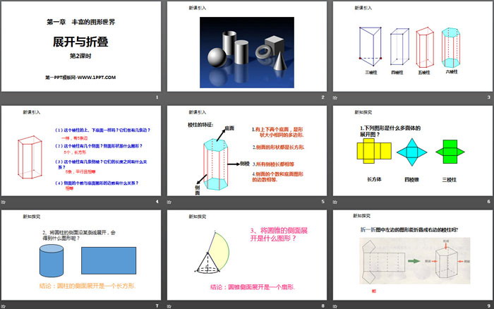 关键词:北师大版七年级上册数学PPT课件免费下载,展开与折叠PPT下载,丰富的图形世界PPT下载,.PPT格式;