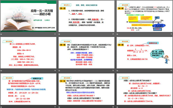 关键词:北师大版七年级上册数学PPT课件免费下载,应用一元一次方程追赶小明PPT下载,一元一次方程PPT下载,.PPT格式;