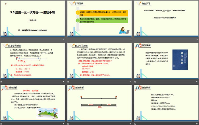 关键词:北师大版七年级上册数学PPT课件免费下载,应用一元一次方程追赶小明PPT下载,一元一次方程PPT下载,.PPT格式;