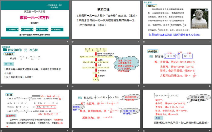 关键词:北师大版七年级上册数学PPT课件免费下载,求解一元一次方程PPT下载,一元一次方程PPT下载,.PPT格式;
