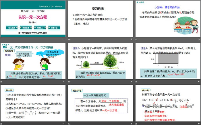 关键词:北师大版七年级上册数学PPT课件免费下载,认识一元一次方程PPT下载,一元一次方程PPT下载,.PPT格式;