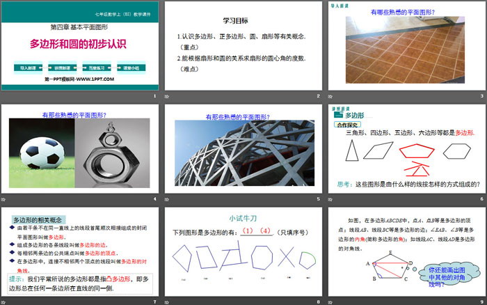 关键词:北师大版七年级上册数学PPT课件免费下载,多边形和圆的初步认识PPT下载,基本平面图形PPT下载,.PPT格式;