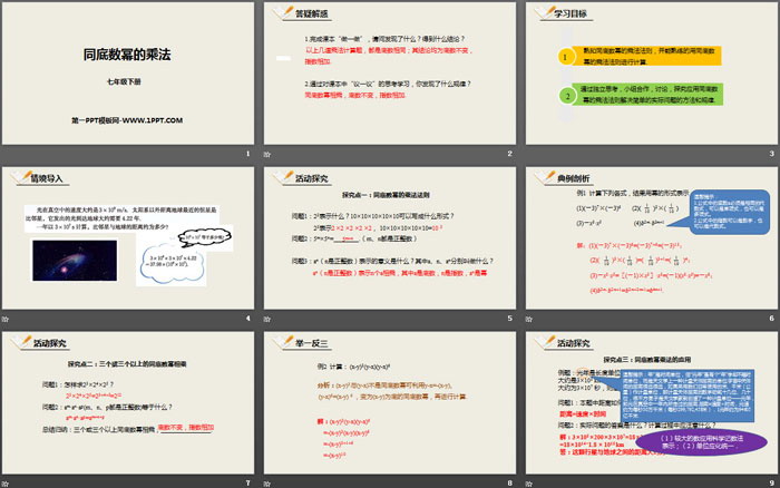 关键词:北师大版七年级下册数学PPT课件免费下载,同底数幂的乘法PPT下载,整式的乘除PPT下载,.PPT格式;