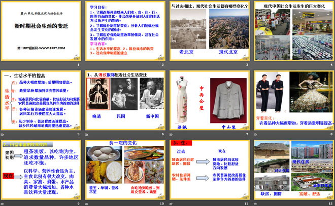 1、了解改革开放以来人们衣、食、住、行、用等方面的变化,体会改革开放对人们的生活方式所产生的影响。