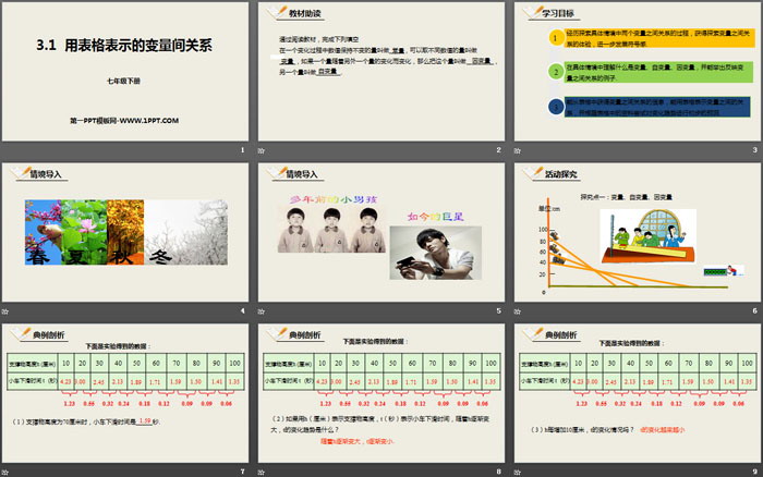 关键词:北师大版七年级下册数学PPT课件免费下载,用表格表示的变量间关系PPT下载,变量之间的关系PPT下载,.PPT格式;