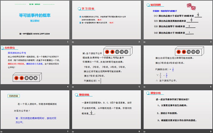 关键词:北师大版七年级下册数学PPT课件免费下载,等可能事件的概率PPT下载,概率初步PPT下载,.PPT格式;