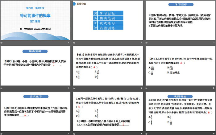 关键词:北师大版七年级下册数学PPT课件免费下载,等可能事件的概率PPT下载,概率初步PPT下载,.PPT格式;