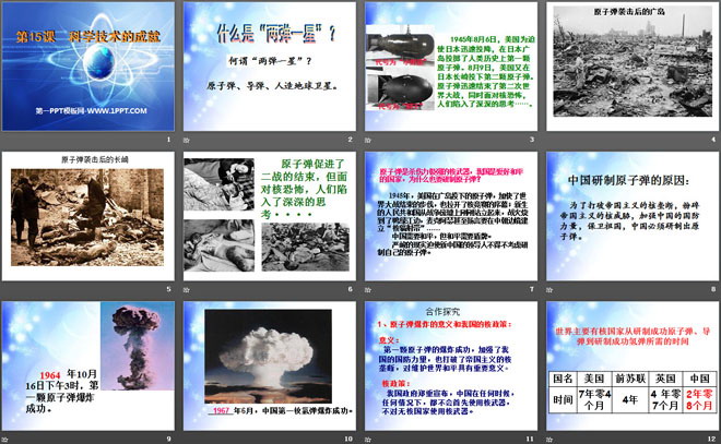 意义:第一颗原子弹的爆炸成功,加强了我 国的国防力量,也打破了帝国主义的核垄断,对维护世界和平具有重要意义。