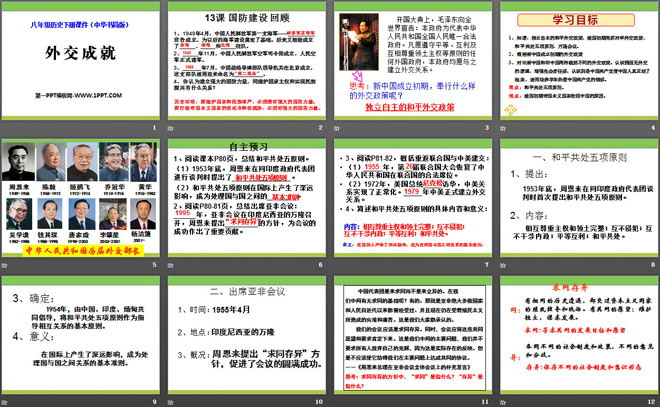 1、知道:独立自主的和平外交政策、建国初期美苏对华外交政策、和平共处五项原则、万隆会议。