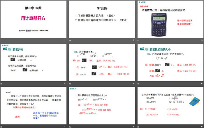 关键词:北师大版八年级上册数学PPT课件免费下载,用计算器开方PPT下载,实数PPT下载,.PPT格式;