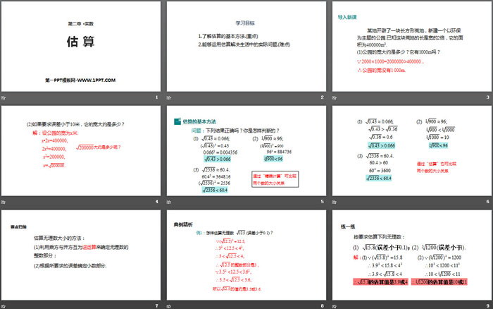 关键词:北师大版八年级上册数学PPT课件免费下载,估算PPT下载,实数PPT下载,.PPT格式;