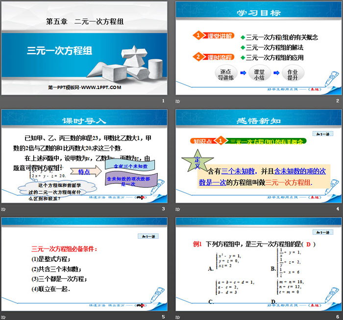 关键词:北师大版八年级上册数学PPT课件免费下载,三元一次方程组PPT下载,二元一次方程组PPT下载,.PPT格式;
