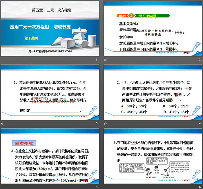 关键词:北师大版八年级上册数学PPT课件免费下载,应用二元一次方程组增收节支PPT下载,二元一次方程组PPT下载,.PPT格式;