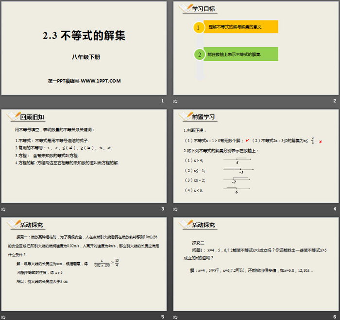 关键词:北师大版八年级下册数学PPT课件免费下载,不等式的解集PPT下载,一元一次不等式和一元一次不等式组PPT下载,.PPT格式;