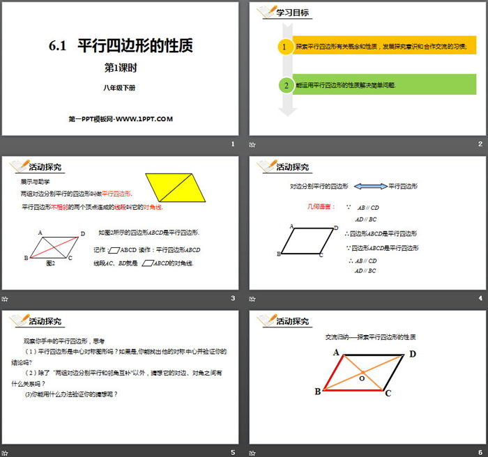 关键词:北师大版八年级下册数学PPT课件免费下载,平行四边形的性质PPT下载,平行四边形PPT下载,.PPT格式;