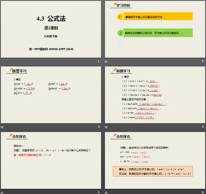 关键词:北师大版八年级下册数学PPT课件免费下载,公式法PPT下载,因式分解PPT下载,.PPT格式;