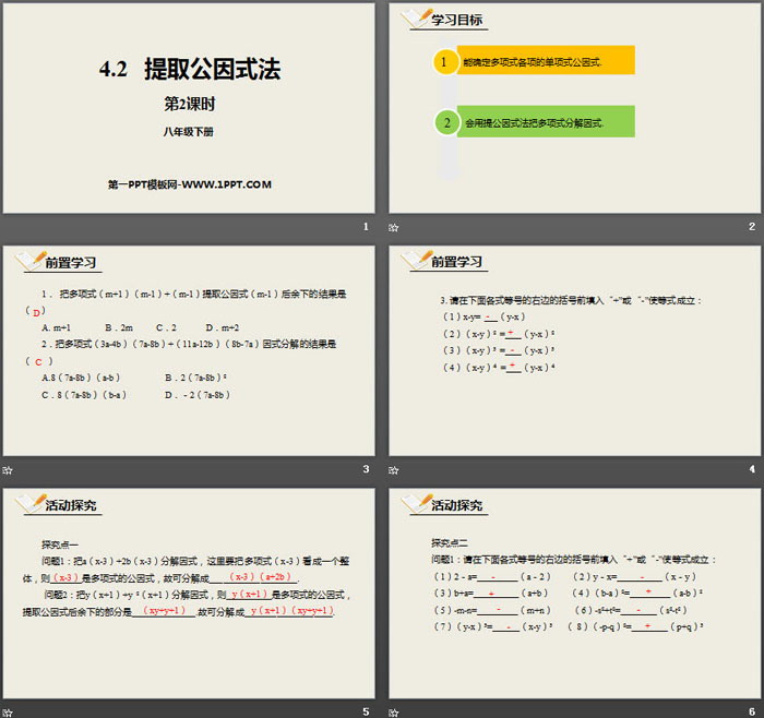 关键词:北师大版八年级下册数学PPT课件免费下载,提取公因式法PPT下载,因式分解PPT下载,.PPT格式;